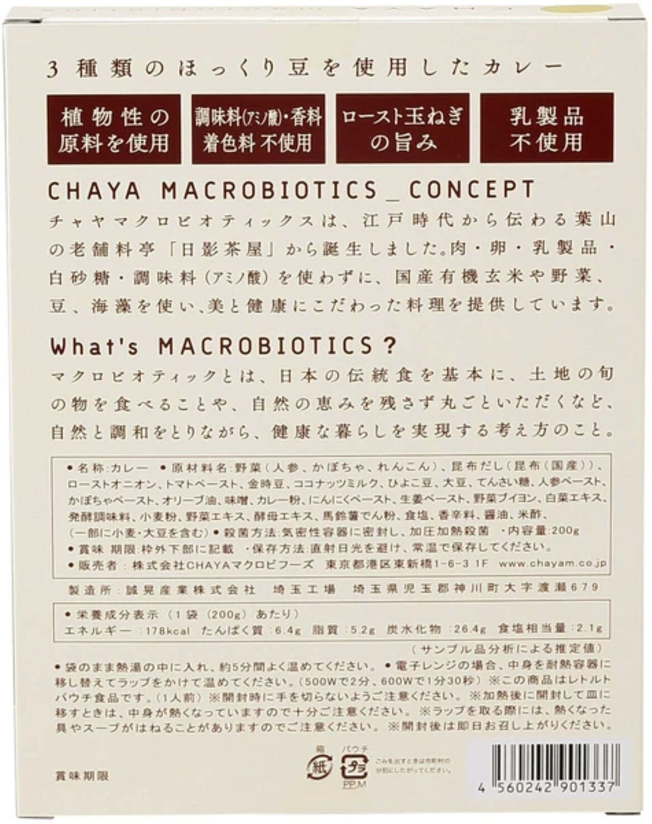 からだにやさしく、おいしい「サステナブルフード」を。江戸時代から続く葉山の老舗料亭「日影茶屋」から生まれたCHAYAマクロビフーズがお届けする、植物性100%のプラントベース豆カレー。