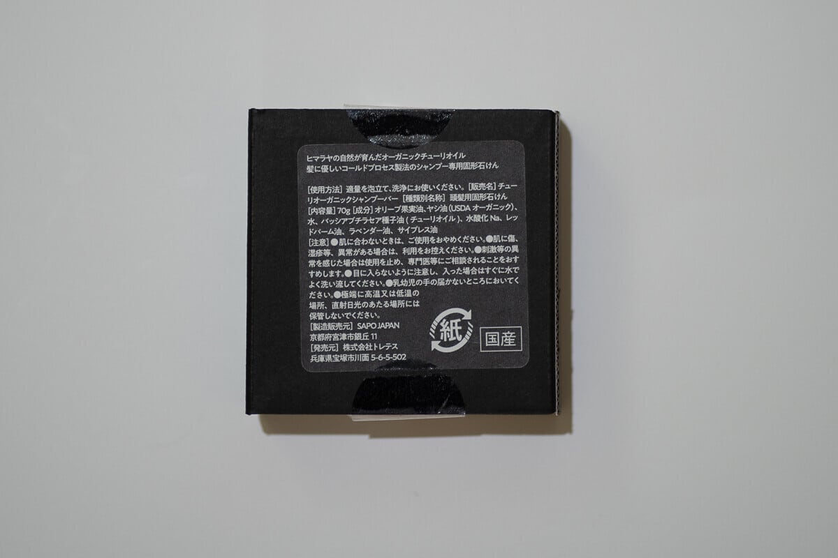 【原材料】オリーブ果実油、ヤシ油(USDAオーガニック)、水、バッシアブチラセア種子油(チューリオイル)、水酸化ナトリウム、デッドパーム油、ラベンダー油、サイプレス油