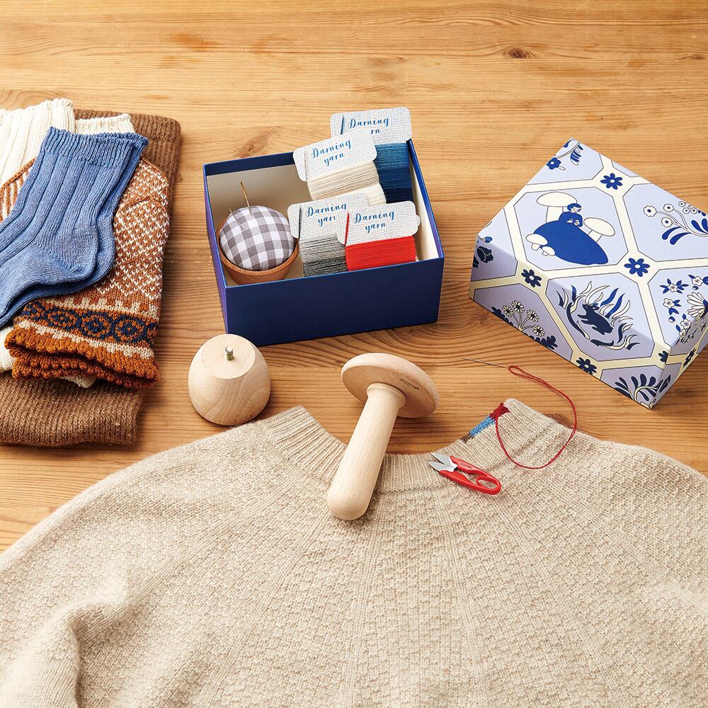 お気に入りの一着を捨てずに、長く大切に着続ける。 ヨーロッパ伝統の衣類修繕技術「ダーニング」がすぐに始められる、道具と糸のコンプリートセットです。穴があいたり、すり切れたりしたニットや靴下を、あえてカラフルな糸でおしゃれに補修して、世界に一つだけのデザインに。